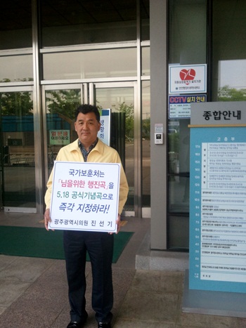 광주시의회 진선기(민주당, 북구1)의원은 15일 국가보훈처 광주지방보훈청 앞에서 “국가보훈처는 '임을위한 행진곡'을 5.18 공식기념곡으로 즉각 지정하라”는 1인시위를 전개했다.